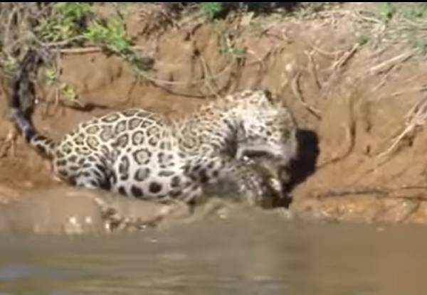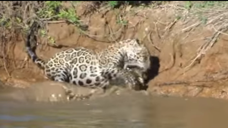 Un jaguar sorprendió a las personas que estaban observándolo al entrar en el agua y sacar un caimán.