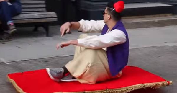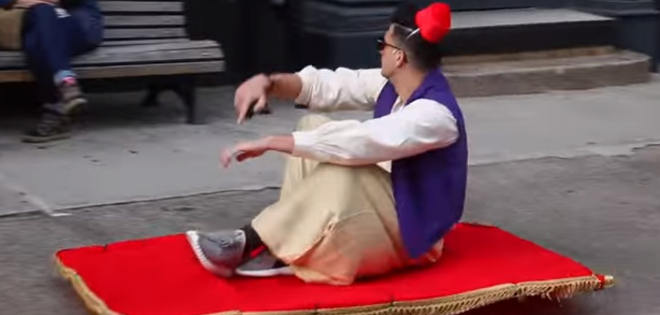 (VIDEO) Mire a Aladino pasear por la ciudad en su alfombra voladora