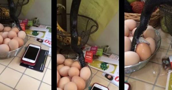 Laura Neff escuchó un fuerte ruido en su cocina. Desde el gabinete de las especias vio descender una serpiente negra hacia una cesta de huevos que estaba en el mostrador, según narró ella en su cuenta de YouTube.