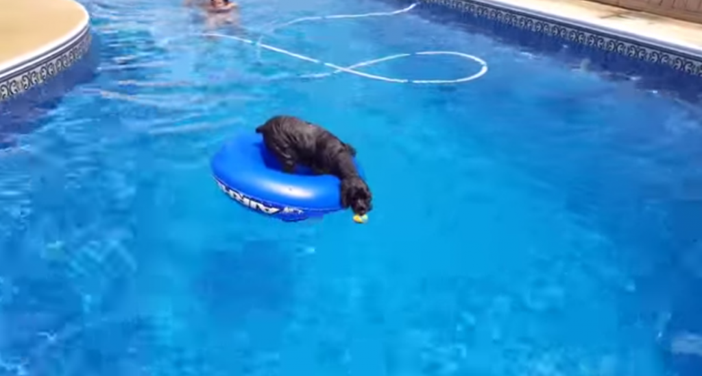 El perro, de razo cocker spaniel su sube a un flotador y logra su cometido; sale de la piscina solo habiéndose mojado las patas y su hocico.