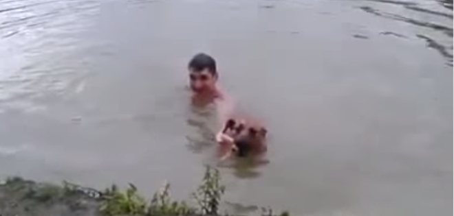 Todo sucede cuando el dueño del perro se tira a un río y finge estar ahogándose.