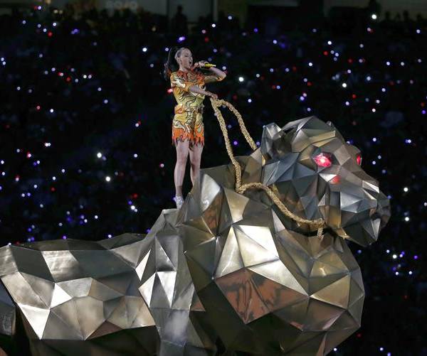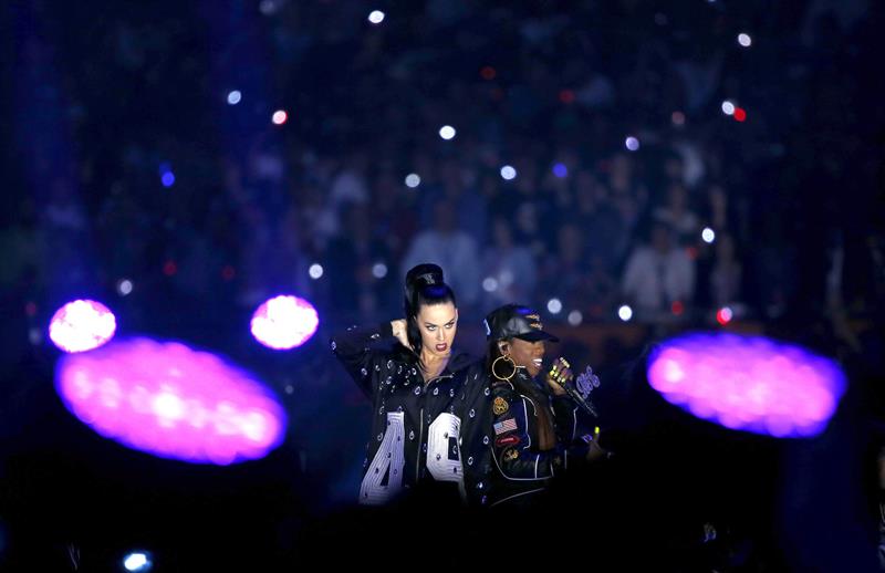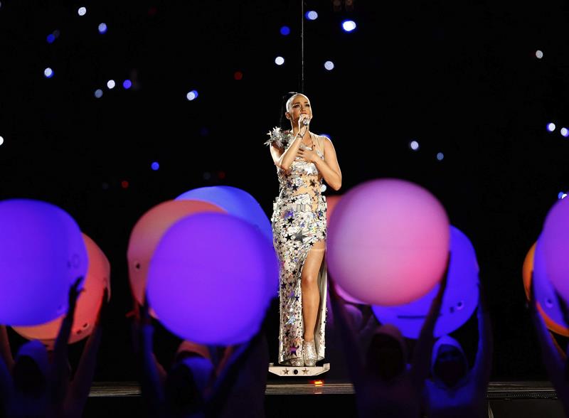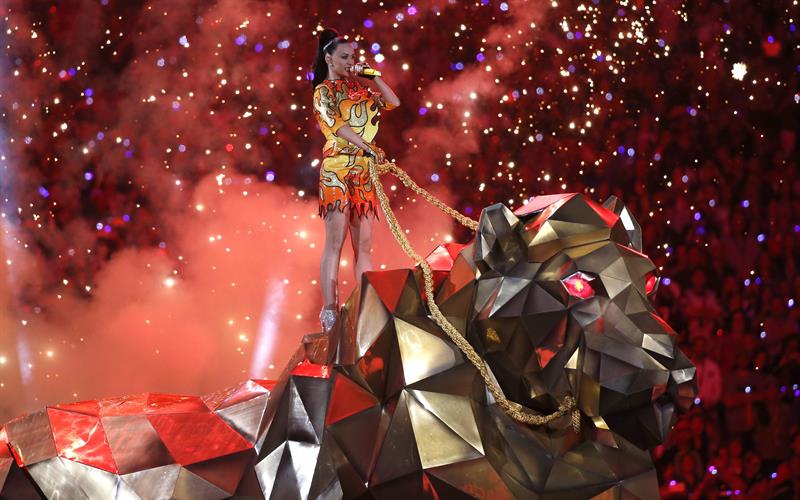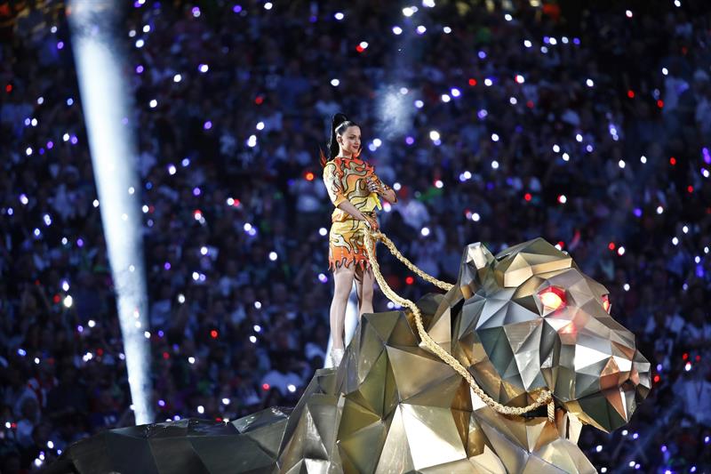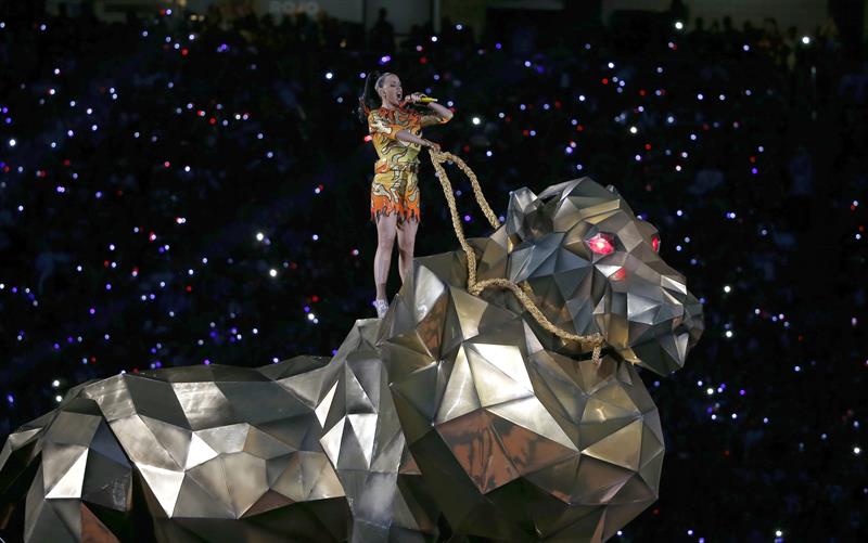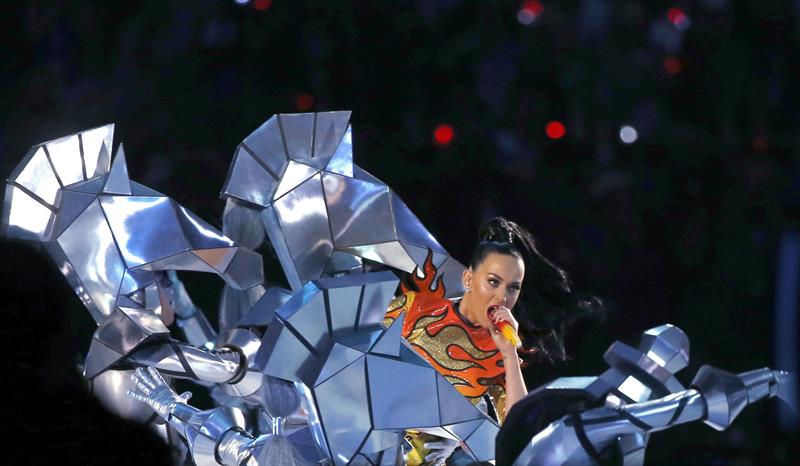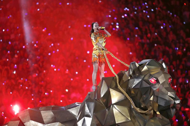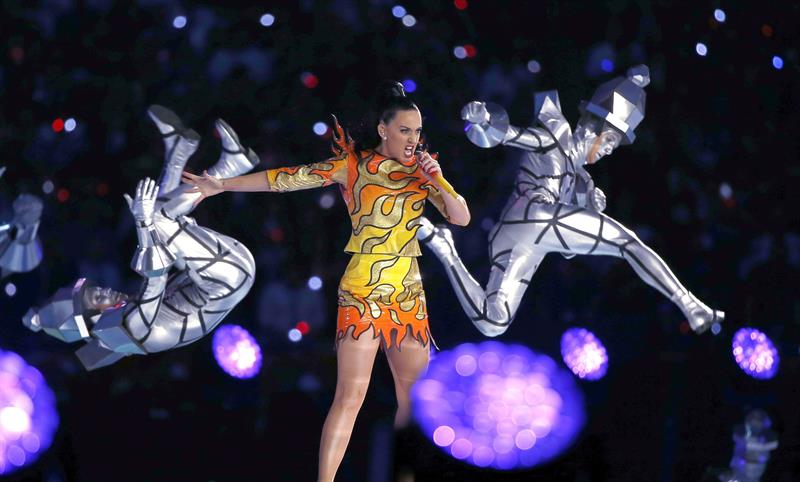 Fiel a su estilo colorido, la cantante Katy Perry llenó de ritmo pop y fuegos artificiales el entretiempo del Super Bowl, un vibrante espectáculo que puso en pie al estadio de Glendale (Arizona, sureste de EEUU) con la ayuda de Lenny Kravitz y Missy Elliott.