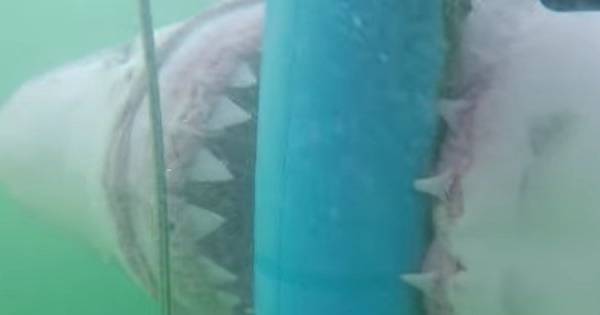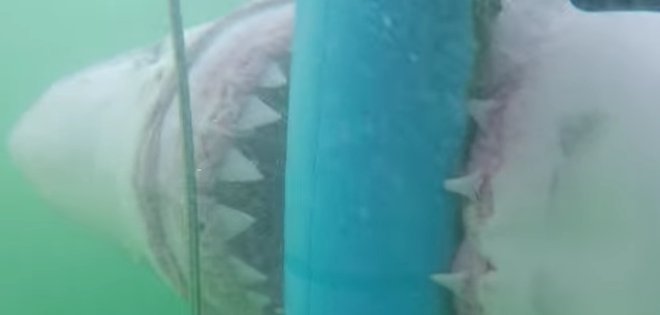 Afortunadamente, una jaula protegía al bañista y consiguió salir rápidamente. El tiburón atacaba con sus dientes las barras de acero.