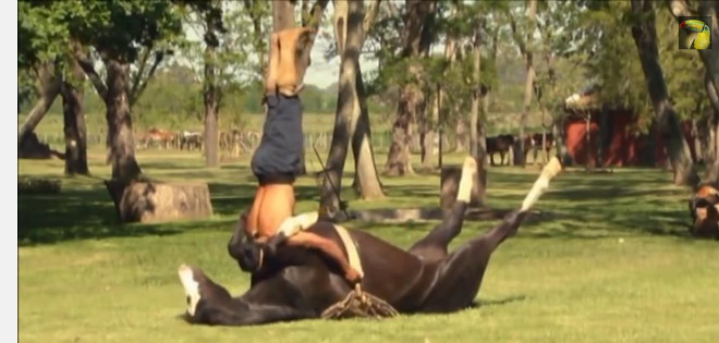 Luego hace que el caballo se acueste sobre su costado, logrando que entre en un estado de relajación similar a un trance.
