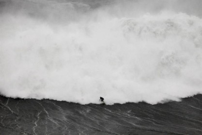 El brasileño Carlos Burle navegó una ola gigante en la playa lusa de Nazaré que puede haber acabado con el récord mundial del estadounidense Garret Mcnamara. Foto: EFE -