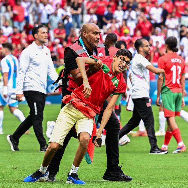 Cuando el reloj se acercaba a los 16 minutos de los 15 agregados por el árbitro antes de finalizar el encuentro, llega el empate agónico de la Albiceleste, lo que desató el malestar de los aficionados marroquíes, quienes invadieron la cancha luego de lanzar vasos mostrando su enojo.