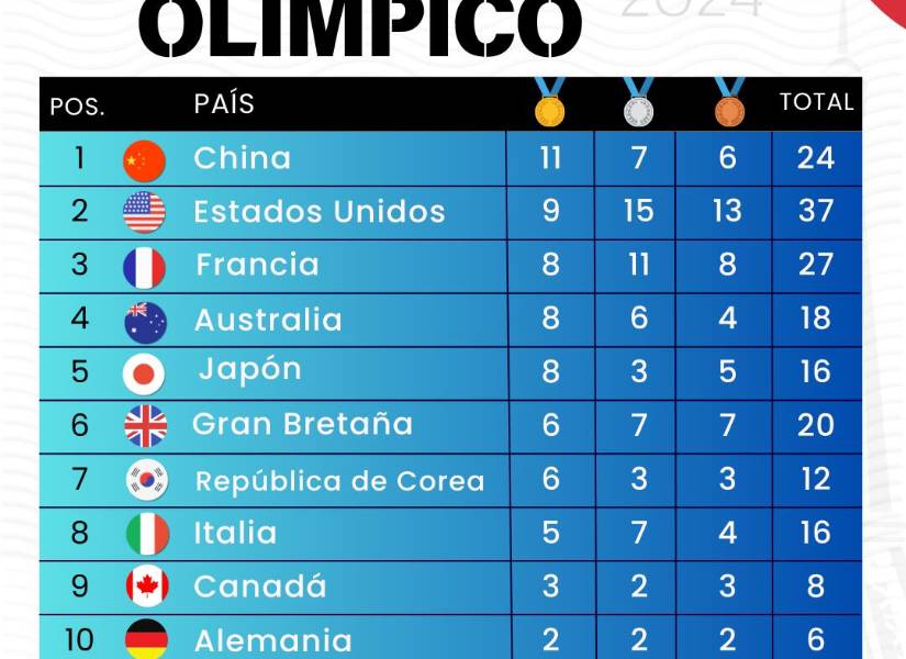 En total, China acumula 11 oros, siete platas y seis bronces; mientras que los sigue Estados con un balance de nueve, 15 y 13, y cierra el podio, Francia con ocho, 11 y ocho.