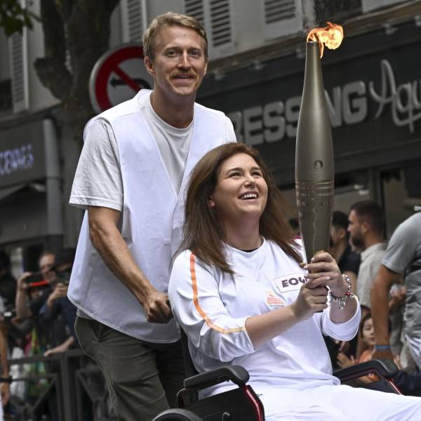 La fotógrafa de Agence France-Presse (AFP) Christina Assi, gravemente herida en Líbano en octubre de 2023, llevó este domingo la antorcha olímpica en un suburbio de París junto al videoperiodista Dylan Collins( )