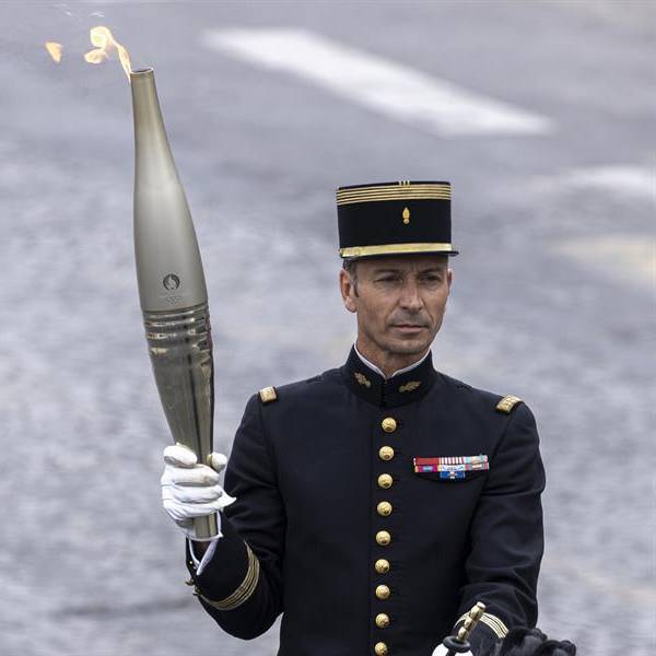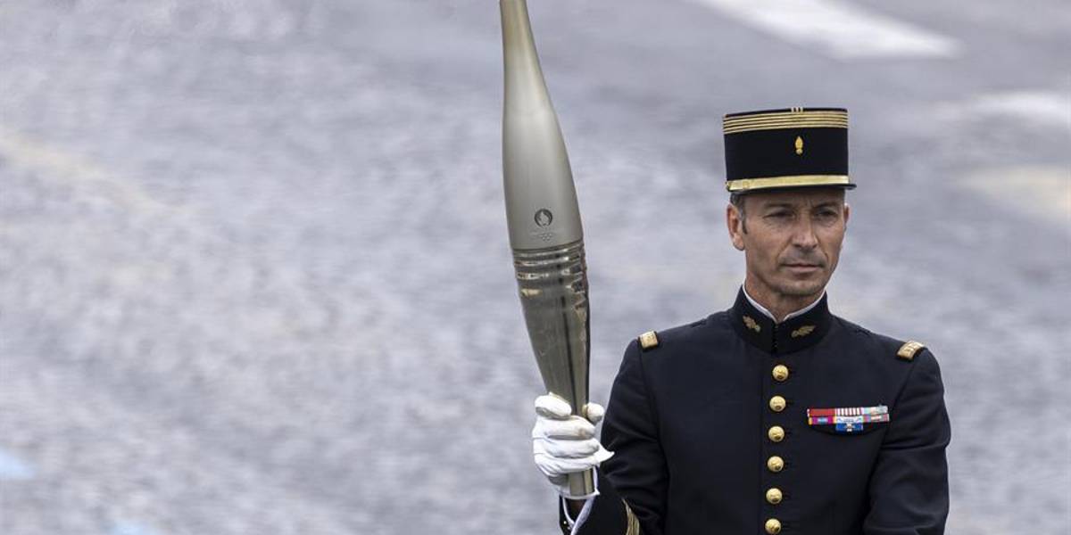 El militar encendió la antorcha a uno de los jóvenes -la manera de pasar el relevo- que fue pasando de manos entre varios de sus colegas, todos vestidos de blanco y situados frente la tribuna presidencial ubicada bajo el Arco del Triunfo, punto culminante de los Campos Elíseos.