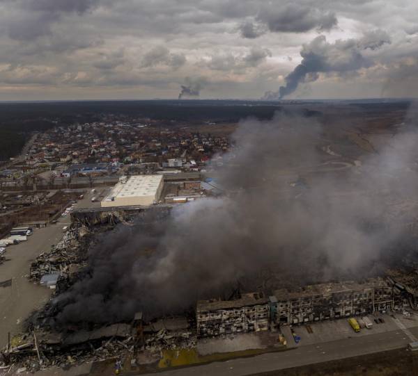 Una fábrica y una tienda arden en llamas después de ser bombardeadas el domingo 6 de marzo de 2022, en Irpin, a las afueras de Kiev, Ucrania. (AP Foto/Emilio Morenatti)