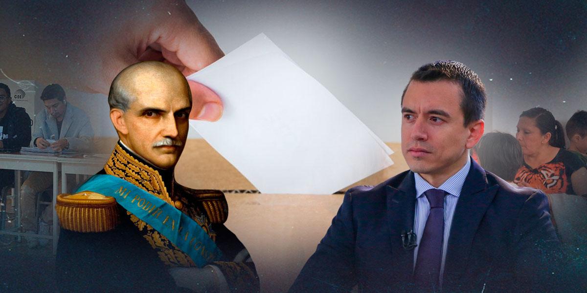 Gabriel García Moreno y Daniel Noboa, en una composición relacionada con las votaciones por consulta popular.( )
