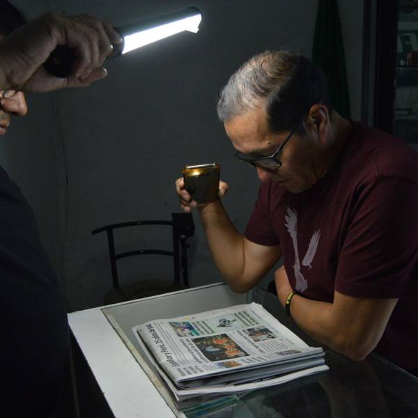 Imagen referencial de una persona alumbrando un periódico con la luz de su celular. ( )
