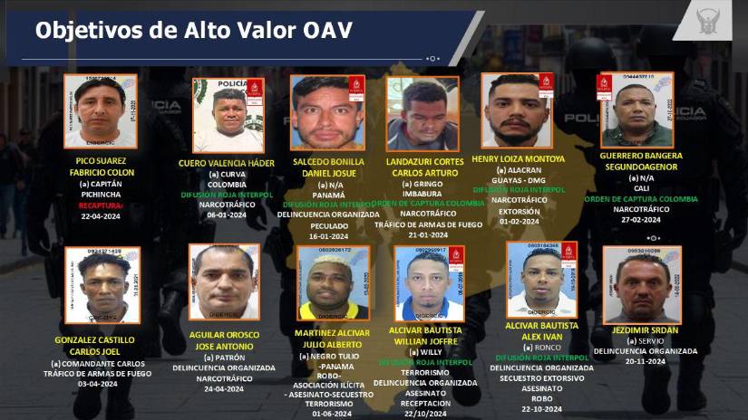 Según los datos del Ministerio del Interior, se han capturado a 13 personas consideradas objetivos de alto valor. Pero la mayoría de ellos como Daniel Salcedo, Jezdimir Srdan, no corresponde al listado inicial de 11, aunque sí están considerados dentro de los esquemas de las organizaciones delictivas como Choneros, Los Lobos, Chone Killers, Los Tiguerones, Latin Kings, Lagartos, Mafia-18, Gánster, Fatales, Águilas, entre otros.