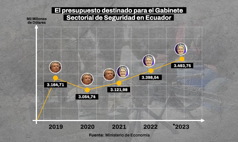 El Gobierno de Lasso, desde 2021, ha destinado hasta abril de este año 9 762 millones de dólares. El monto, según Finanzas, incluye salarios, equipamiento y el Plan Anual de Inversiones de las 13 instituciones que conforman el sectorial de seguridad, entre esas, la Policía, SNAI, ministerio del Interior, ministerio de Defensa, el Centro de Inteligencia Estratégica, entre otros.