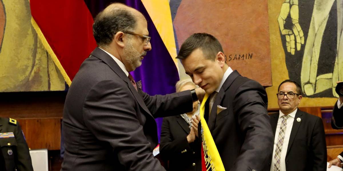 23 de noviembre de 2023. Daniel Noboa se pone la banda presidencial en la Asamblea. ( )