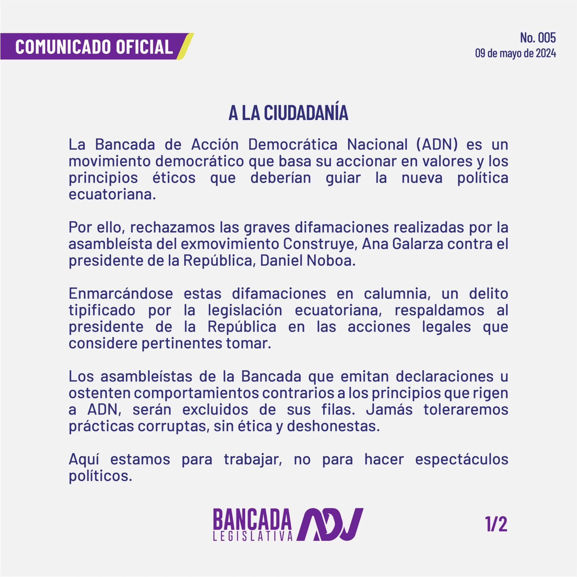 La asambleísta Ana Galarza, de Construye, dijo en una entrevista radial que el presidente Daniel Noboa amenazaba a los legisladores de ADN con colocar droga en sus vehículos si dejaban la bancada.