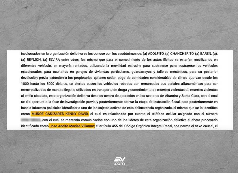 Según el expediente, se lo relaciona a través del uso de un teléfono celular "con el cual se mantenía comunicación con uno de los líderes de esta organización delictiva el ahora procesado identificado como Jose Adolfo Macías Villamar", según el proceso.