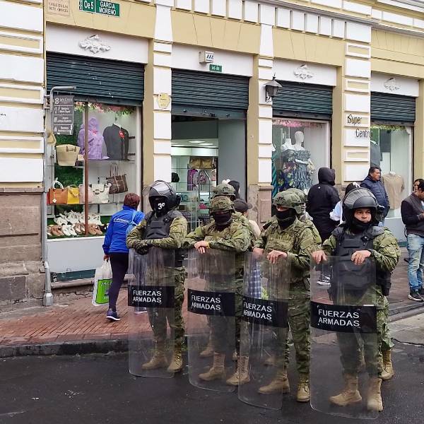 Los militares recorrían las calles del Centro Histórico de Quito en medio de los transeúntes, turistas y vehículos. Vestían sus trajes de camuflaje verde, cascos y llevaban escudos transparentes con adhesivos pegados en la mitad que decían Fuerzas Armadas. La gente los observaba con curiosidad, mientras se desarrollaban las actividades de los comercios y demás negocios, pero el imponente despliegue de seguridad provocaba un clima de inquietud entre los ciudadanos, que los observaban con atención.