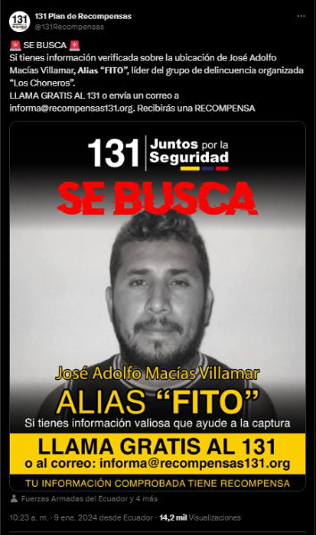Sin embargo, no es la primera vez que se anuncia la entrega de dinero para poder dar con el paradero del cabecilla de Los Choneros. En enero de 2024, cuando se confirmó su fuga, el Gobierno estipuló el plan de recompensas mediante la línea 131.