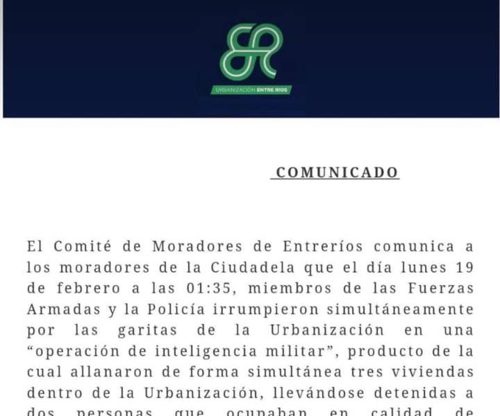 Tan solo una semana antes de lo sucedido en La Romareda, el 19 de febrero de 2024, en la ciudadela Entre Ríos, ubicada en Samborondón, también se llevaron a cabo allanamientos simultáneos en tres viviendas como parte de un operativo militar. Durante esa madrugada, miembros de las Fuerzas Armadas detuvieron a dos personas.