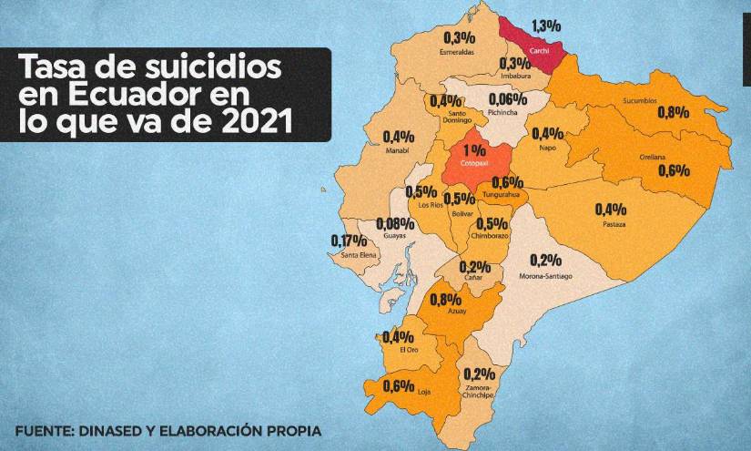 Durante 2020 las cinco provincias con la tasa de suicido más alta por cada 10.000 habitantes fueron Carchi, Guayas, Sucumbíos, Orellana y Azuay. Sin embargo, la misma tendencia se repite en lo que va de 2021 para Carchi, donde se han cometido 25 suicidios, cinco más que en todo el año anterior.