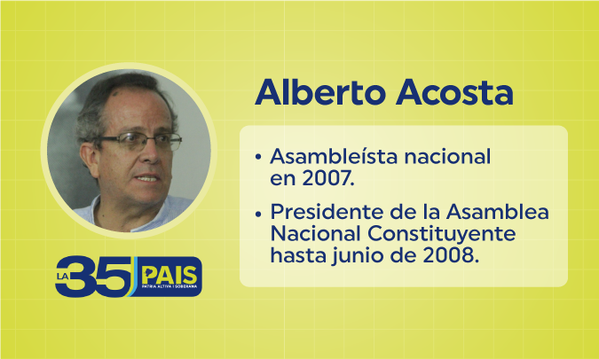 Alberto Acosta fue presidente de la Asamblea Constituyente desde diciembre de 2007 hasta junio de 2008 cuando se hicieron más fuertes las diferencias con el mandatario, Rafael Correa. Acosta se ha mantenido crítico del proceso de la Revolución Ciudadana y al Socialismo del siglo XXI. Paso de ser el fundador del movimiento Alianza PAIS a su detractor. En 2013, fue candidato presidencial por la Unidad Plurinacional de las Izquierdas y logró apenas el 3,26% de los votos.