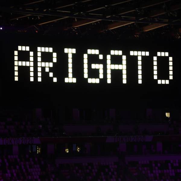 'Gracias' en Japónes se proyectó en la pantalla del estadio.( )