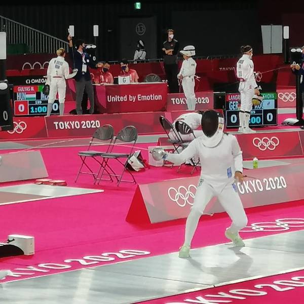 Cuaspud (derecha) durante su participación en esgrima.( )