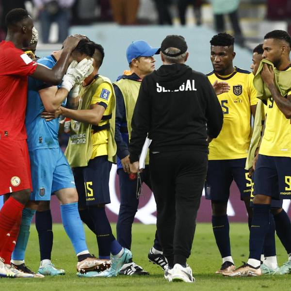 Jugadores de Ecuador se lamentan tras el partido de la fase de grupos del Mundial de Fútbol Qatar 2022 entre ante Senegal.( )