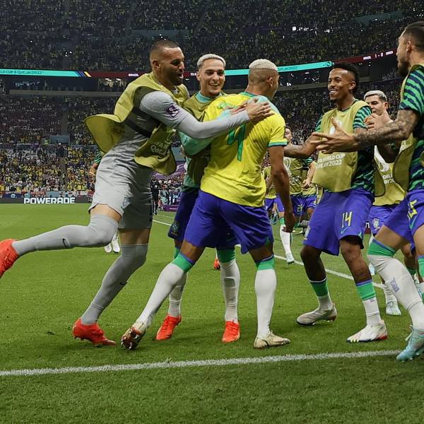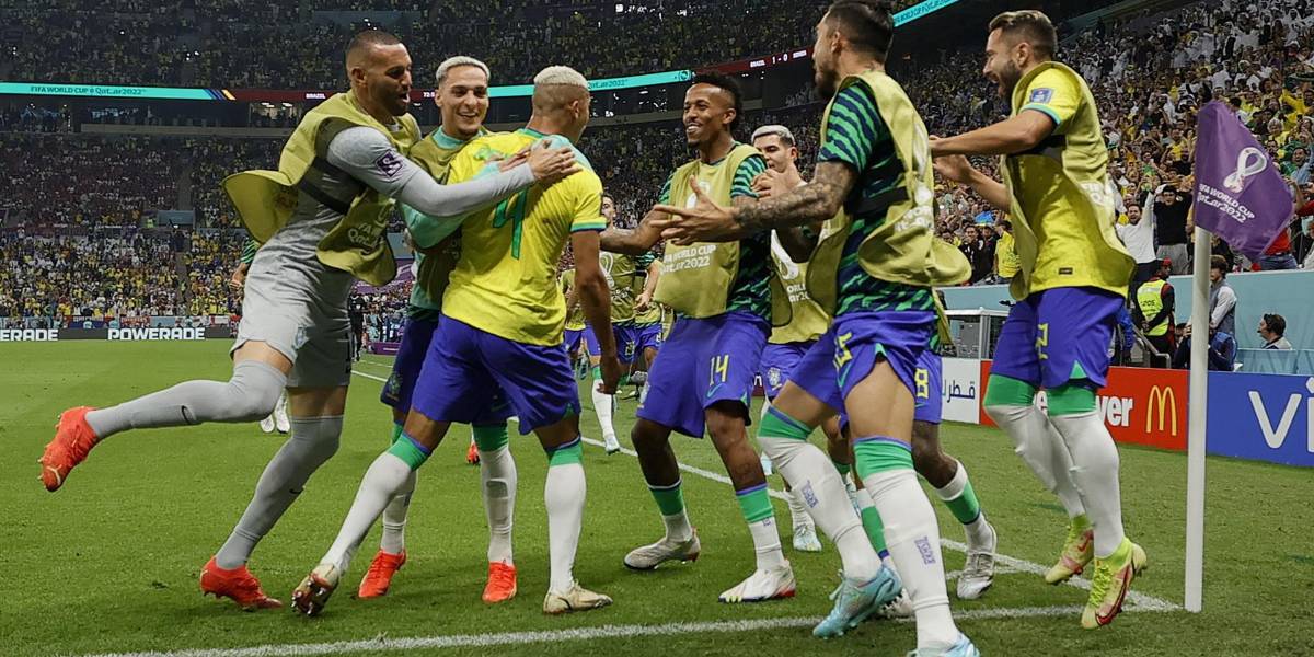 Los jugadores de Brasil felicitan a Richarlison (c) luego de marcar un doblete para la victoria de la auriverde.( )