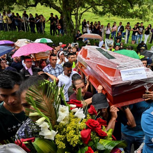 COLOMBIA.- Familiares y amigos cargan ataúdes durante el funeral colectivo de las víctimas del deslizamiento. Foto: AFP