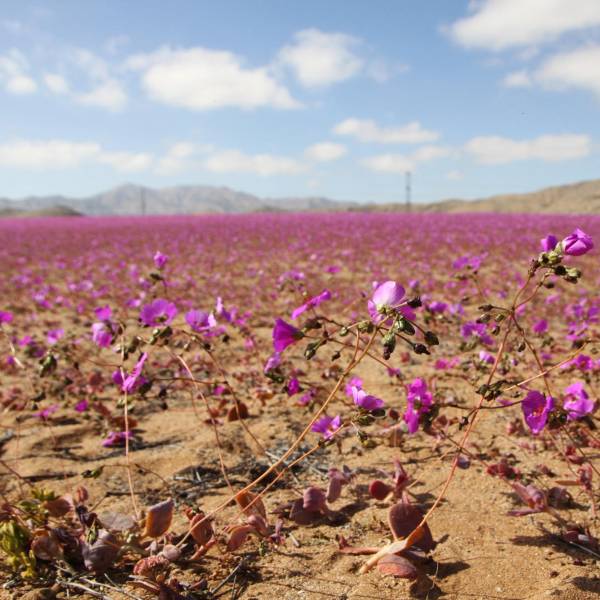 El desierto de Atacama, el más árido del planeta, se vistió con un traje de flores moradas y blancas por varios kilómetros, gracias a las inusuales lluvias registradas en esta zona del norte de Chile.