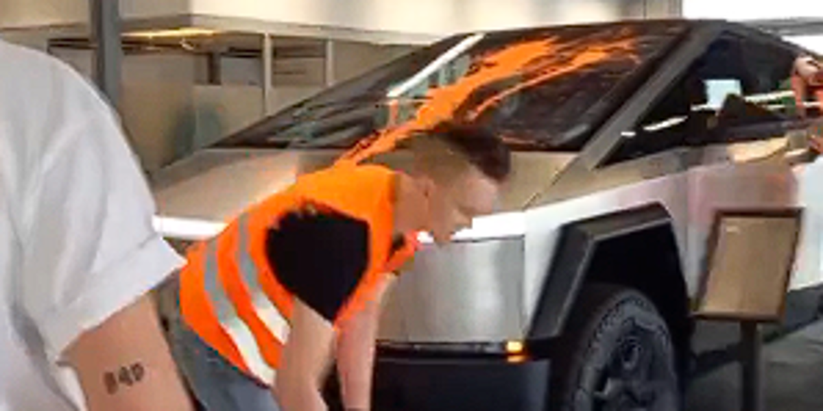 Activistas vandalizando el Cybertruck de Tesla en Alemania. ( )