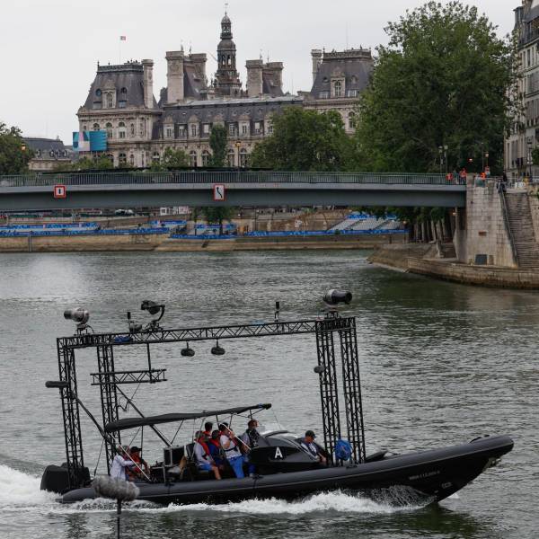 Una lancha con material técnico navega por el río Sena antes del inicio de la ceremonia de inauguración de los Juegos Olímpicos de París 2024( )