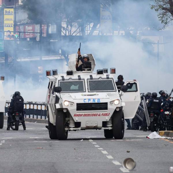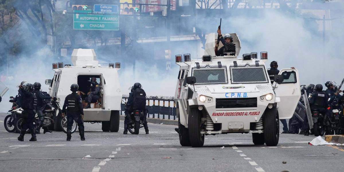 Integrantes de la Policía Nacional Bolivariana (PNB) enfrentan a manifestantes opositores este lunes, durante una protesta contra de los resultados de las elecciones presidenciales, en Caracas.( )