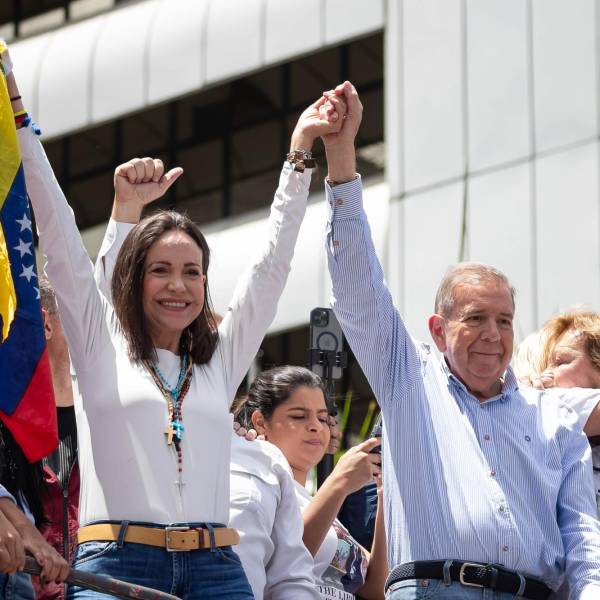 La líder opositora venezolana María Corina Machado (i) y el candidato a la presidencia de Venezuela Edmundo González Urrutia saludan en una manifestación de apoyo este 30 de julio de 2024, en Caracas.( )