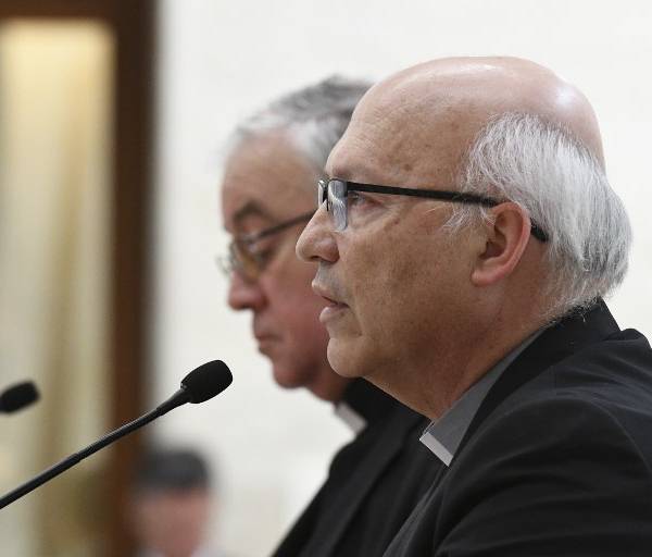 Luis Fernando Ramos Pérez (R) y Juan Ignacio González dan una conferencia de prensa en el Vaticano. Foto: AFP