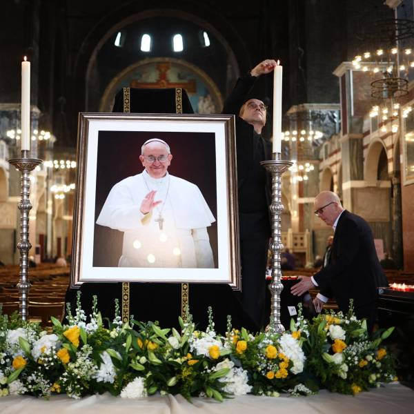 El personal de la catedral instaló una imagen del papa Francisco en la Catedral Metropolitana de la Preciosísima Sangre, conocida informalmente como la Catedral de Westminster, en el centro de Londres, el 21 de abril de 2025, tras la noticia de su fallecimiento.( )