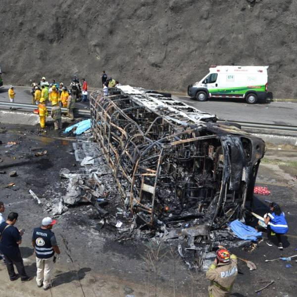 Imágenes de televisoras locales muestran al autobús volcado sobre la carretera totalmente calcinado y reducido a fierros retorcidos por las llamas, mientras que la parte frontal del camión de carga quedó por completo deshecha.