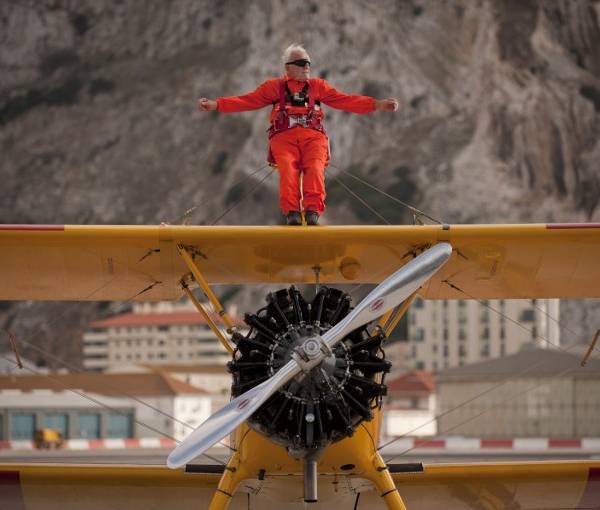 Tom Lackey, un acróbata británico de 94 años, desafió hoy los límites de la naturaleza con una nueva hazaña que le ha permitido volar con el cuerpo atado a un avión biplano "Boeing Stearman" alrededor del peñón de Gibraltar.