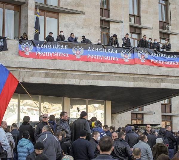 Un grupo de activistas irrumpieron en la sede de la administración de la región de Donetsk izando banderas rusas sobre el edificio y colocando carteles del movimiento separatista "República de Donetsk".