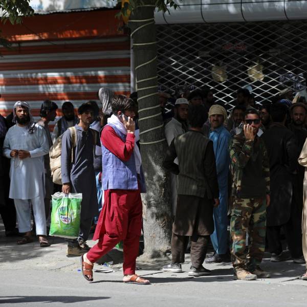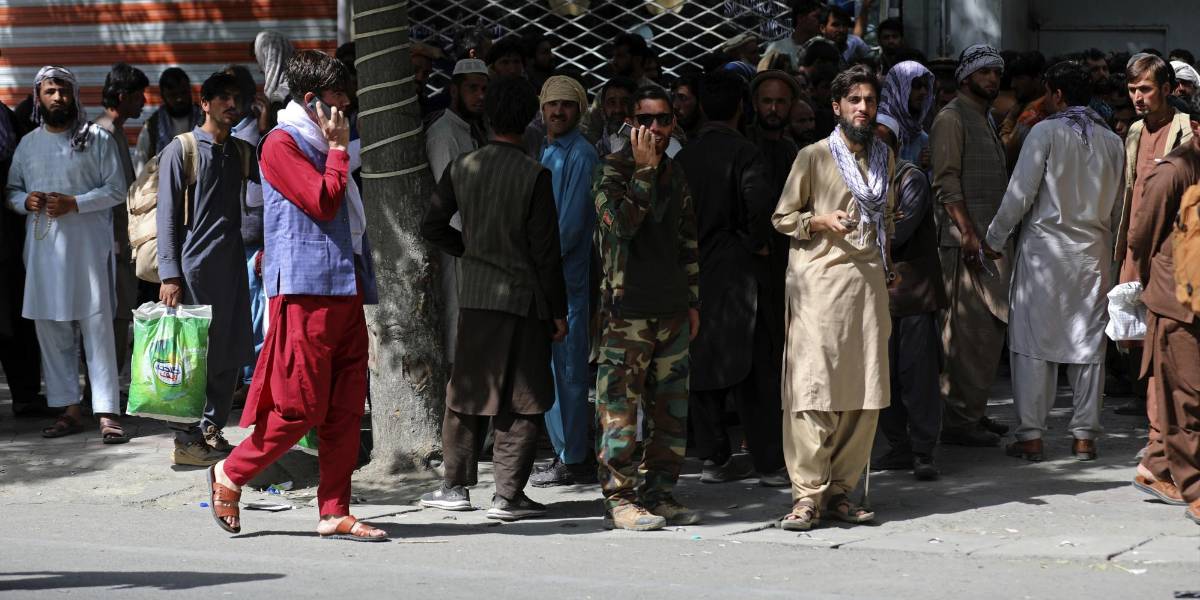 Afganos hacen largas filas el domingo 15 de agosto de 2021 para retirar dinero de un banco, en Kabul, Afganistán.( )