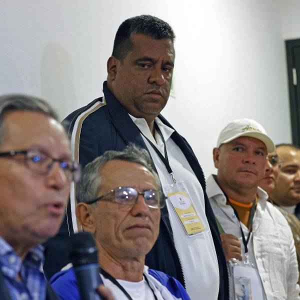 Fotografía de archivo del 26 de noviembre de 2024 del integrante de los Comandos de Frontera, Giovanny Andrés Rojas (c), observando al jefe de la delegación del Gobierno de Colombia, Armando Novoa García (i), y al exintegrante de las FARC 'Walter Mendoza' (2-i) durante una rueda de prensa, en Bogotá (Colombia). ( )