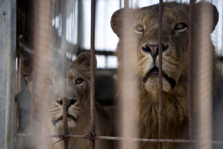 Silenciosos, un león y una leona no se mueven salvo cuando Farid les tira dos pollos muertos. A poca distancia, siete perros salvajes dan vueltas en una parcela repugnante de tres metros por tres.