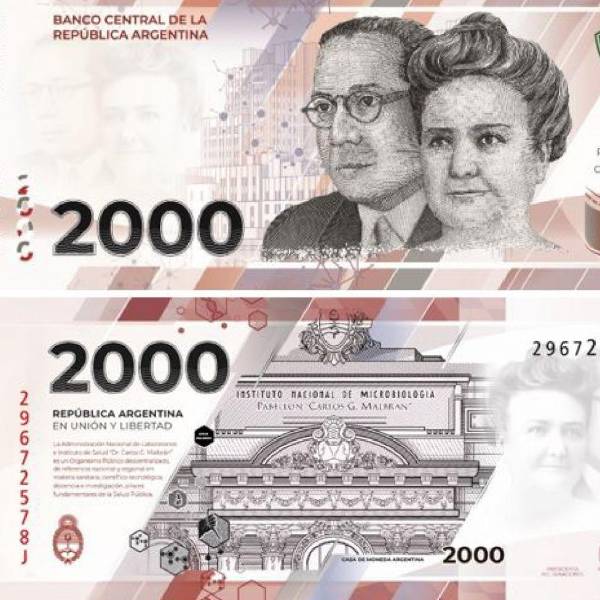 A partir de hoy entra en circulación el #Billete2000Pesos conmemorativo de curso legal con la imagen del Instituto Malbrán, de la Dra. Cecilia Grierson y el Dr. Ramón Carrillo, precursores en el desarrollo de la medicina en la Argentina.