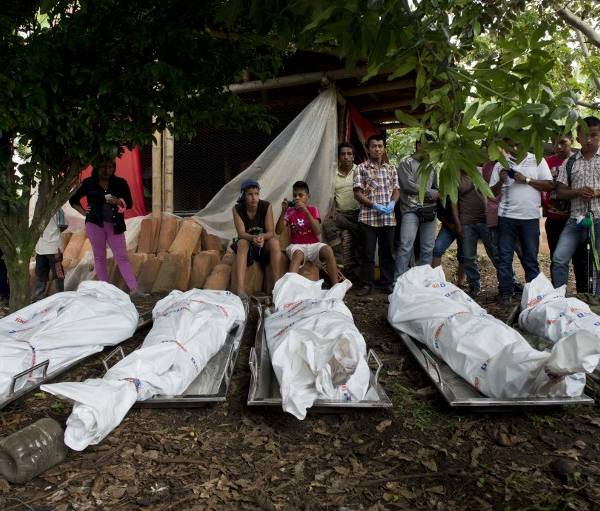 Los cadáveres de los cinco soldados asesinados por las Fuerzas Revolucionarias de Colombia en el Cauca este 19 de diciembre, último ataque realizado antes del cese al fuego. Foto: AFP.