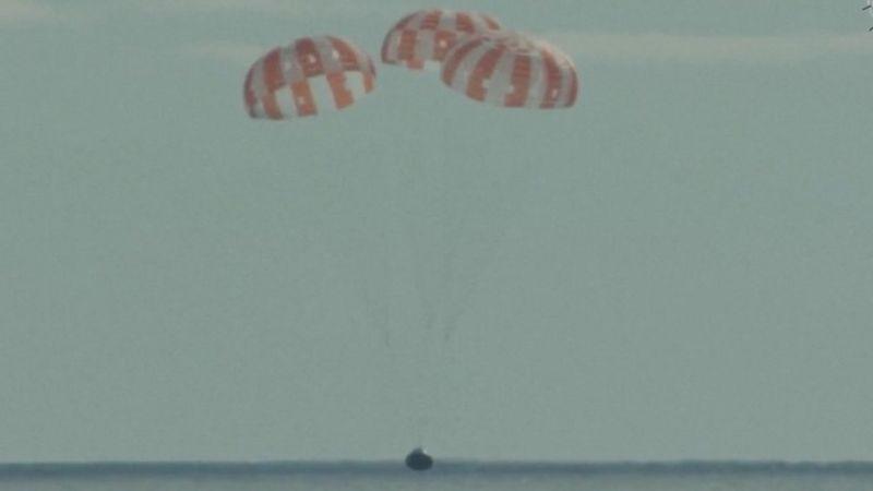 La espectacular vista de los 11 paracaídas de la cápsula desplegándose e inflándose en secuencia fue una clara indicación de que el escudo térmico había hecho su trabajo.