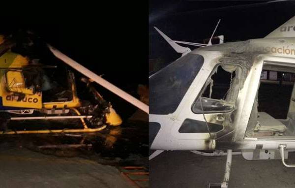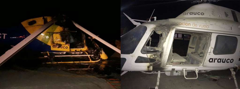 Ataque incendiario dejó dos helicópteros destruidos en Curanilahue. Foto: Twitter
