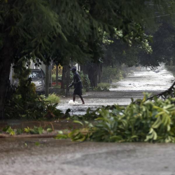 Una persona camina por una calle inundada de La Habana debido al paso del huracán Rafael. EFE/ Ernesto Mastrascusa( )