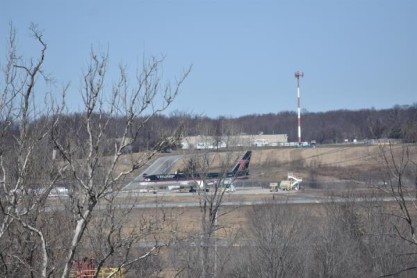El avión descansa a la intemperie en la zona de carga del aeropuerto de Stewart.